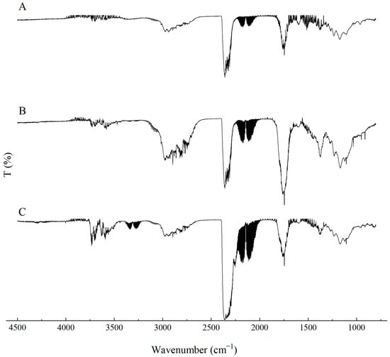 The analysis of toxic gaseous products was performed using a coupled analytical system comprising an Omega 5 Bruker gas analyzer (Bruker, Billerica, MA, USA) equipped with an FTIR spectrometer, connected to an F1 Libra 209 Netzsch thermogravimetric analyzer (TG) (Netzsch, Selb, Germany). Thermal decomposition of samples with masses of 10 ± 1 mg was conducted at three temperatures, 450 °C, 550 °C and 750 °C, in synthetic air with a flow rate of 40/20 µL/min (nitrogen/oxygen). The decomposition programs were set so that gases produced during thermal degradation were collected for 30 min, with a 15 min isothermal segment at each temperature. The gaseous products formed during decomposition were analyzed in real time using FTIR spectroscopy (Bruker, Billerica, MA, USA), enabling the recording of gas evolution as a function of temperature. Spectra were recorded at intervals of 7–8 s (10 scans), at a resolution of 4 cm−1, in the mid-infrared range (MIR) from 400 to 4500 cm−1, in transmission mode. The obtained spectral data were analyzed using OPUS GA 5.2.11.9 software (Bruker, Billerica, MA, USA), where absorbance values were converted into concentrations (ppm). Subsequently, based on Equation (1), the concentrations expressed in ppm were converted to values in g/m3.