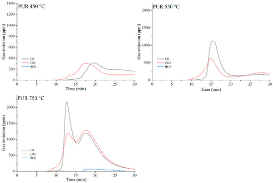 Real-time gas emission profiles of PUR foams at 450, 550 and 750 °C.