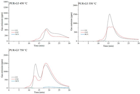 Real-time gas emission profiles of the PUR-G3 composites at 450, 550 and 750 °C.
