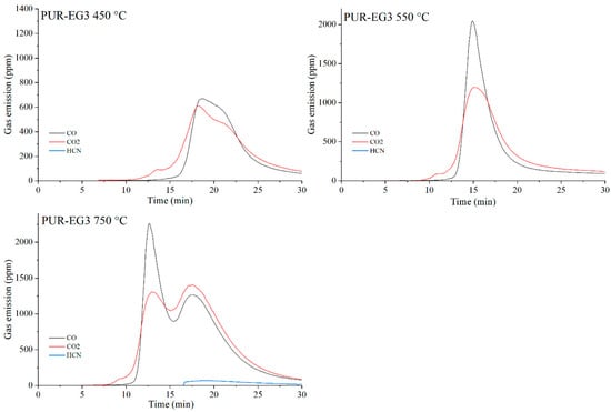 Real-time gas emission profiles of the PUR-EG3 composites at 450, 550 and 750 °C.