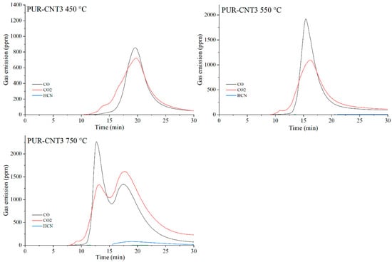 Real-time gas emission profiles of the PUR-CNT3 composites at 450, 550 and 750 °C.
