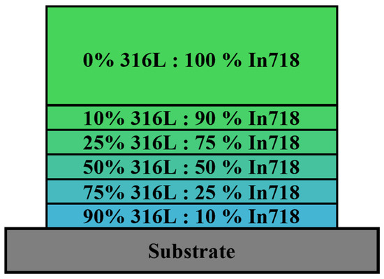 The graded layer structure manufactured in this study is shown in Figure 1. The high 316L content in the bottom layer was selected to achieve a good adhesion to the substrate (similar E-modulus, no additional brittle phases), while the gradual increase in In718 content in the subsequent layers creates a smooth transition to the In718 top layers. Four layers were deposited for the 100% In718 top layer (all other ratios were deposited with a single layer).