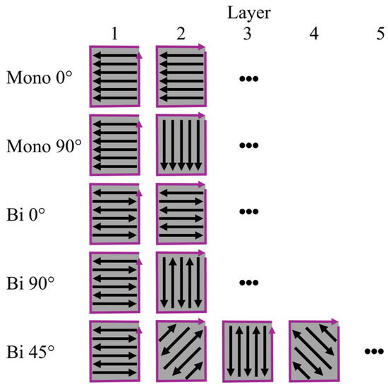 Figure 2 shows the different deposition strategies examined in this study. These strategies result from the deposition strategy method (monodirectional or bidirectional) and the angle between the individual layers (0°, 45°, or 90°).