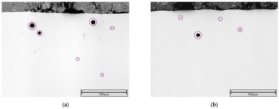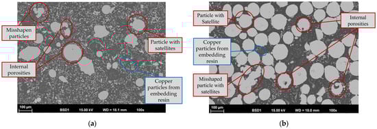 Most of the particles exhibit a spherical or nearly spherical shape. A spherical particle shape is beneficial for uniform deposition due to, e.g., better inflight behavior and uniform melting. Nevertheless, both powders also include irregularly shaped particles, spherical particles with satellites (fine particles that adhere to larger particles) and fine particles. The latter are more common in the Inconel 718 powder. These features, along with other factors, negatively impact flowability and can lead to defects caused by uneven melting. The particles compactness and internal porosity were examined using metallographically prepared cross-sections (see Figure 4).