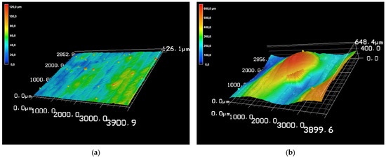 Confocal scanning laser microscope (CLSM) top-view image in 3D perspective of (a) FG-2 example for a suitable sample and (b) FG-7 unsuitable sample.