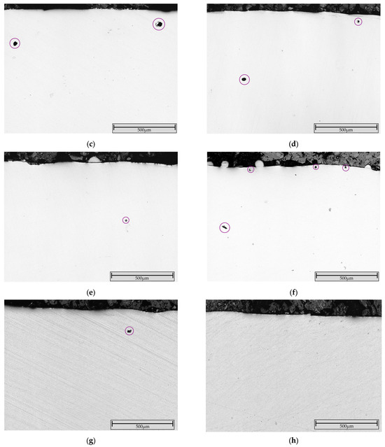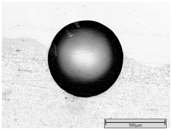 Brinell hardness measurements (62.5 kp) at the layer–substrate interface revealed no cracks or delamination (Figure 7).
