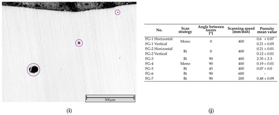 Unetched CLSM cross-section image of (a) FG-1 horizontal (within one track; monodirectional, 0°, 400 mm/min); (b) FG-1 vertical (several tracks; monodirectional, 0°, 400 mm/min); (c) FG-2 horizontal (within one track; bidirectional, 0°, 400 mm/min); (d) FG-2 vertical (several tracks; bidirectional, 0°, 400 mm/min); (e) FG-3 (bidirectional, 90°, 400 mm/min); (f) FG-4 (monodirectional, 90°, 400 mm/min); (g) FG-5 (bidirectional, 45°, 400 min/min); (h) FG-6 (bidirectional, 90°, 600 mm/min); and (i) FG-7 (bidirectional, 90°, 200 mm/min). Porosity is circled in purple and dark gray spots inside structure are precipitations. (j) Table with correlating manufacturing parameters and mean porosity value.