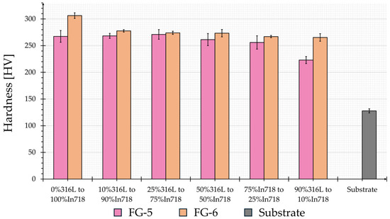 Both samples exhibit significantly higher microhardness compared to the substrate. The measured microhardness values and the progression across the various 316L to Inconel 718 ratios correspond to the literature [35,37,39]. Kim et al. [39] observed cracks at a ratio of 70% 316L to 30% Inconel 718 and the 80% 316L to 20% Inconel 718. Layers. These cracks result in a microhardness drop. Although there is a slight decrease in hardness for FG-5 between 75% 316L and 25% Inconel 718 and the 90% to 10% layer, no cracks were found in the indentation or the surrounding areas. The decrease may be influenced by underlining pores, which soften the area. A general survey of all samples tested revealed that no cracks are present. The microhardness of FG-6 is higher than that of FG-5 across the entire structure and exhibits a lower standard deviation. Furthermore, the hardness distribution of FG-6 does not show any sudden drops, but rather reflects the continuous progression in hardness as indicated in the literature. Considering that FG-6 does not exhibit any pores, the sample was deemed to be the optimum of the parameter examined. Within the combinations examined in this study, a bidirectional deposition strategy with 90° shifting between layers and a scan speed of 600 mm/min achieves the best results. The laser input per unit length for this combination is 22 J/mm, which is about one-third of the 60 J/mm determined by Banait et al. [34]. However, it should be noted that they deposited a different material (NiCrBSi); additionally, they used a different powder feed rate (4 g/min versus 1 g/min in this study). With a smaller powder feed rate, a relatively large amount of energy per gram of powder is available, which ensures complete particle melting. This enables thinner layers and reduces the risk of overheating and distortion.