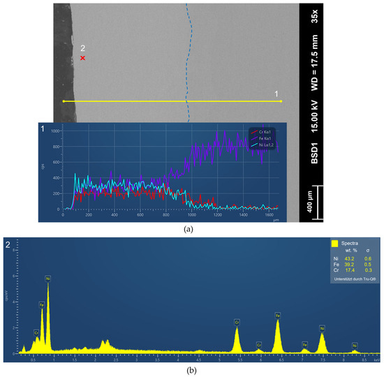 SEM analysis of optimal parameter combination of the evaluated samples (sample FG-6): (a) backscatter electron detector (BSD) image with energy dispersive X-ray spectroscopy (EDS) line scan (1; yellow) and corresponding diagram showing the progression of chemical composition (only Ni, Cr and Fe selected). Layer–substrate interface highlighted with blue dashed line. (b) EDS spot analysis of top layer (2, red cross in BSD-image (a)).