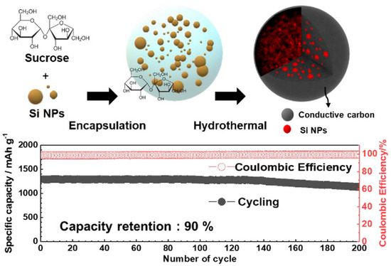 Schematic illustration of the one-pot hydrothermal synthesis of the meso–macroporous Si–C composite, showing 40 wt.% Si nanoparticles embedded within carbon spheres (~3 μm) with hierarchical porosity (top), and electrochemical performance of the composite anode in lithium-ion cells, demonstrating an initial capacity of 1300 mAh·g−1, 90% capacity retention after 200 cycles, and corresponding Coulombic efficiency (bottom). Reprinted with permission from Ref. [29], Copyright 2020, American Chemical Society.