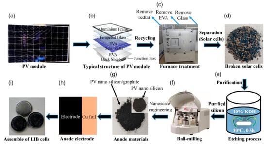 Schematic overview of the recycling and reuse pathway for silicon recovered from end-of-life photovoltaic modules: (a–d) disassembly and recovery of silicon cells; (e) chemical purification via KOH treatment; (f,g) conversion into nanosilicon and nanosilicon/graphite hybrid materials; and (h,i) fabrication of anode electrodes and assembly of lithium-ion battery cells. Ref. [36] is an open-access article distributed under the terms of the Creative Commons CC BY license, which permits unrestricted use, distribution, and reproduction in any medium provided the original work is properly cited.