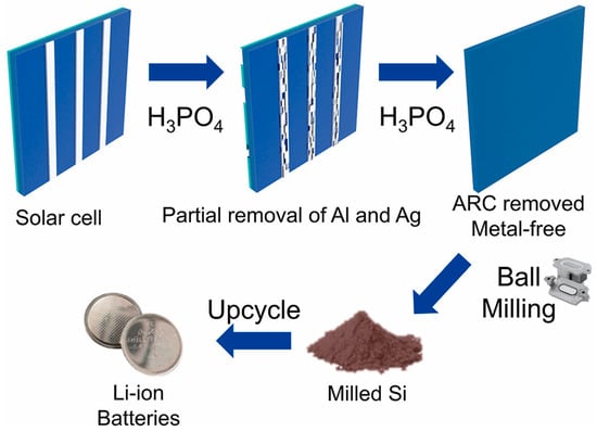 Similarly, Sim and co-workers introduced a simplified one-step recovery approach in which expired silicon cells are treated in hot diluted phosphoric acid [37]. This single-step process simultaneously removes the Al back-contact layer and the SiNx anti-reflective coating while detaching Ag electrodes, achieving a silicon recovery yield of 98.9% with a purity of 99.2%. Subsequent ball milling reduces the particle size to approximately 100 nm. When evaluated as a lithium-ion battery anode, the recycled nano-Si delivers a specific capacity of 1086.6 mAh·g−1 after 500 cycles at 1C, while maintaining a Coulombic efficiency exceeding 99%. The overall upcycling pathway for end-of-life silicon solar cells is schematically illustrated in Figure 5. As shown in Figure 5, the phosphoric-acid-assisted treatment enables the simultaneous removal of metallic contacts and surface coatings in a single step, significantly simplifying the recycling process and reducing chemical and processing complexity. This streamlined pathway, followed by mechanical size reduction, directly supports the practical feasibility of producing metal-free nanosilicon from photovoltaic waste for reuse in lithium-ion battery anodes.