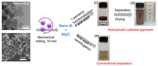 Formation pathway of hydrophobic colloidal silicon nanoparticles via nanoscale magnesiothermic reduction: (a) TEM image of nanosilica precursor and (b) SEM image of nano-Mg used for mechanical milling; (c) phase separation during acid washing, showing the hydrophobic nanosilicon layer floating above the aqueous MgCl2-containing solution; (d) dry nanosilicon powder obtained at gram-scale yield in a single batch; and (e) comparison with conventional acid washing and centrifugation, where significant loss of fine silicon particles leads to a turbid supernatant even after high-speed centrifugation. Reprinted from Ref. [38], Copyright 2017, with permission from American Chemical Society.