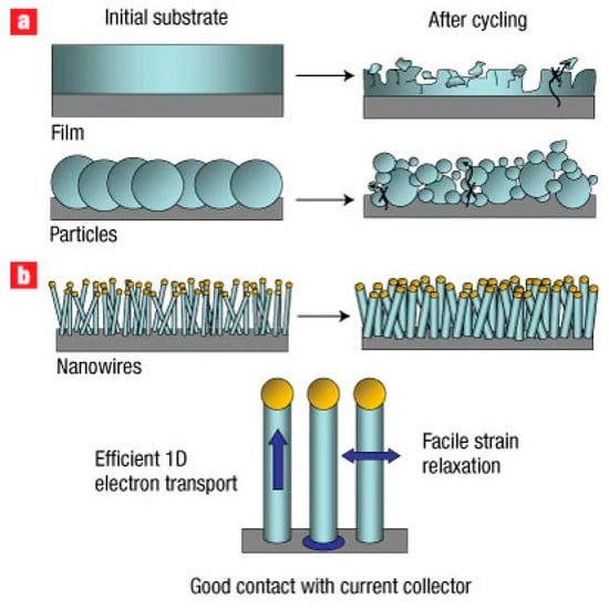 To illustrate the fundamental mechanical advantages of one-dimensional silicon architectures, Figure 7 schematically compares the lithiation-induced morphological evolution of conventional bulk silicon electrodes and silicon nanowire–based anodes. As shown in Figure 7, the radial and axial strain relaxation enabled by the nanowire geometry suppresses pulverization and loss of electrical contact, directly explaining the superior cycling stability and rate performance observed for SiNW-based anodes.