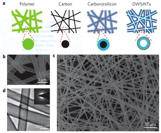- Hwang, T.H.; Lee, Y.M.; Kong, B.-S.; Seo, J.-S.; Choi, J.W. Electrospun Core–Shell Fibers for Robust Silicon Nanoparticle-Based Lithium Ion Battery Anodes. Nano Lett. 2012, 12, 802–807. [Google Scholar] [CrossRef]