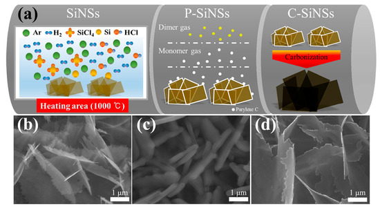 The global demand for high-energy, long-cycle-life lithium-ion batteries continues to increase rapidly due to the rapid expansion of electric vehicles, grid-scale renewable energy storage, and portable electronics [1,2,3]. While commercial graphite anodes provide stable cycling performance and low cost, their practical use is fundamentally restricted by a limited specific capacity of 372 mAh·g−1 [4]. Silicon, possessing an exceptionally high theoretical capacity of approximately 3579 mAh·g−1 [5], has long been regarded as one of the most promising next-generation anode materials.