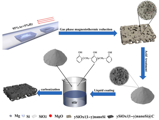 - Hong, F.; Zhou, R.; Gao, C.; Liu, Y.; Sun, Z.; Jiang, Y. Fabrication of Porous SiOx/nanoSi@C Composites with Homogeneous Silicon Distribution for High-Performance Li-Ion Battery Anodes. J. Alloys Compd. 2023, 947, 169511. [Google Scholar] [CrossRef]