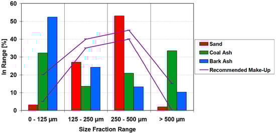 As an example, this relationship is illustrated in Figure 3, where the solid line represents the recommended the range of PSD for the inert material as specified by the CFB boiler supplier. The term “make-up material” (or simply “make-up sand”) refers to the inert bed material in this case, sand that is periodically added to the fluidized bed to compensate for losses caused by attrition or elutriation during boiler operation. For stable operation, the mean particle diameter of the bed material should remain within the range of 150–200 μm. As shown, neither the ash produced from coal nor from biomass combustion meets these requirements, and even the delivered sand often falls outside the optimal range. This discrepancy clearly indicates improper material selection and inadequate quality management of sand supply.
