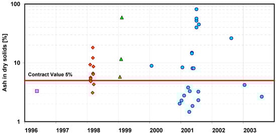Example of biomass deliveries contaminated with mineral impurities (markers on the graph indicate different fuel deliveries).