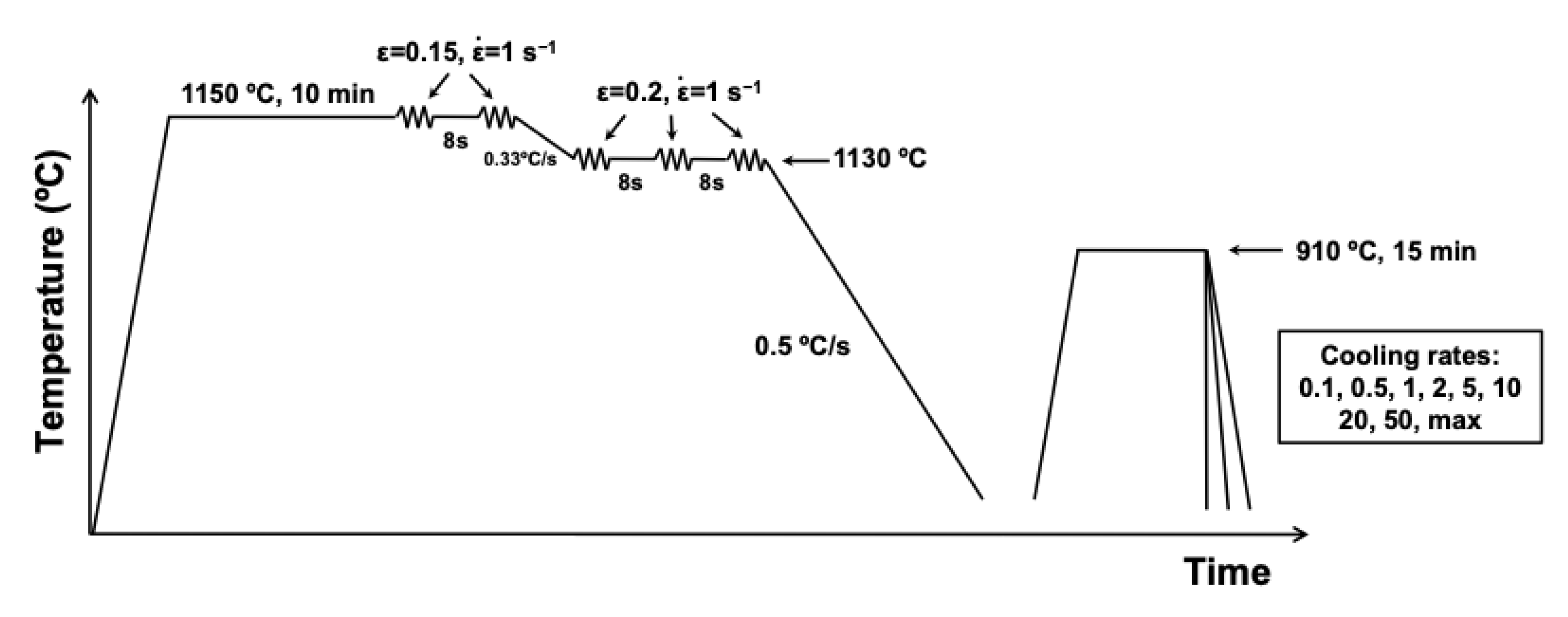| Reheating T (°C) | Deformation T (°C) | Strain per Pass | Strain Rate (s−1) | |