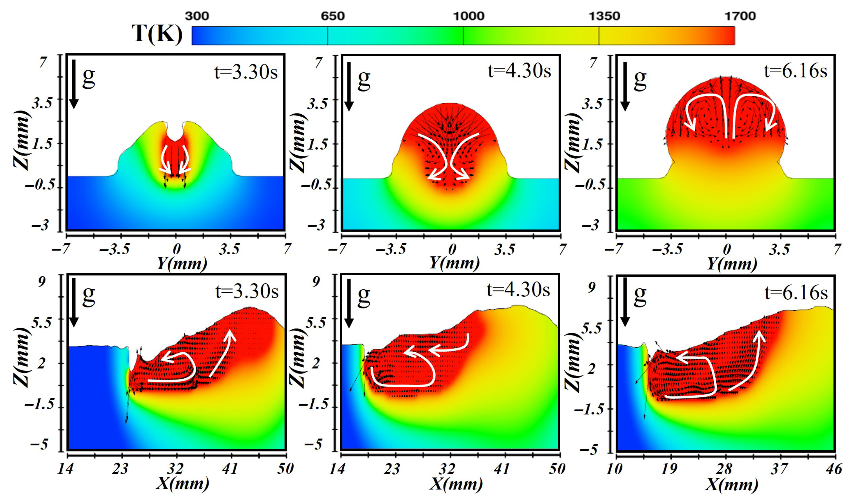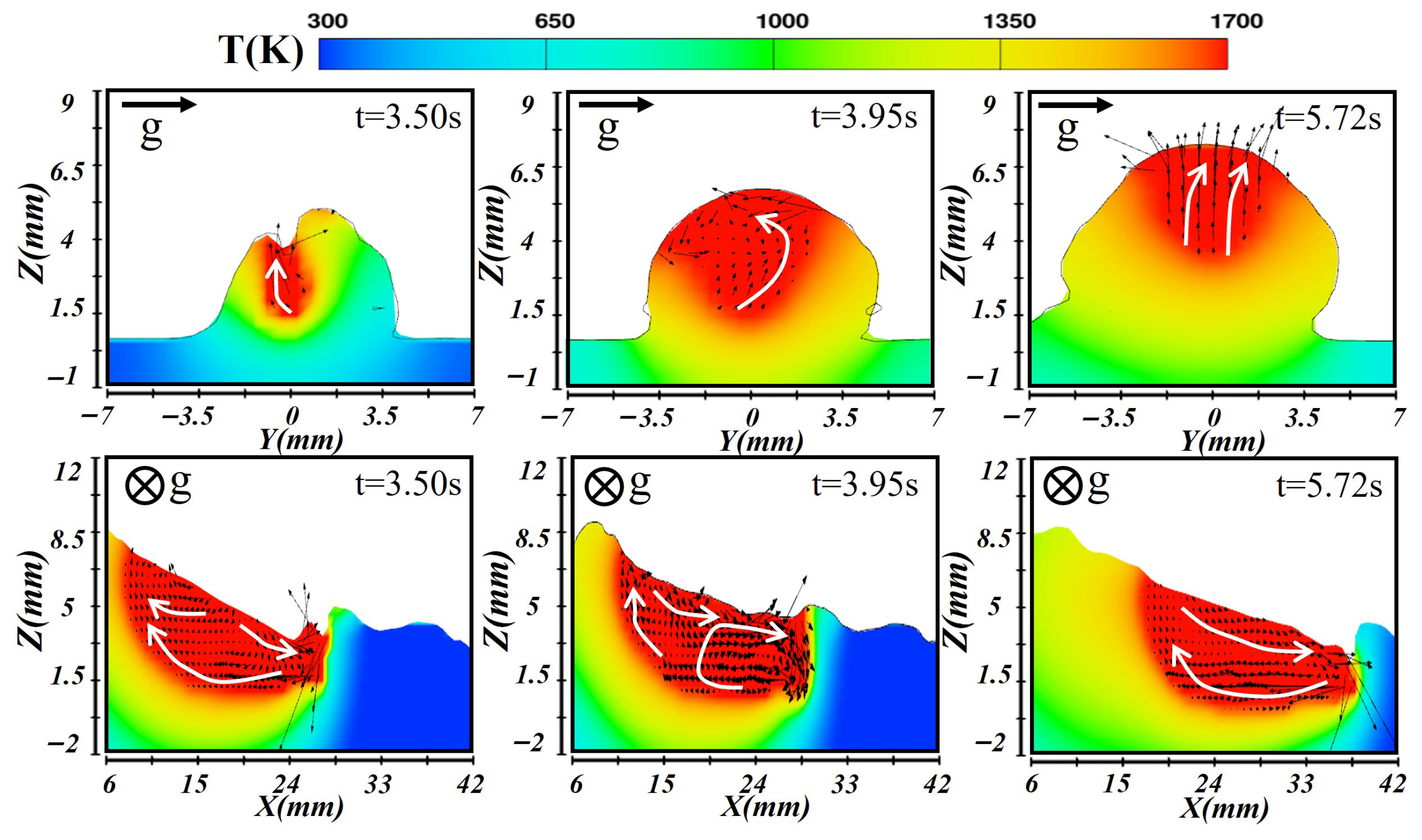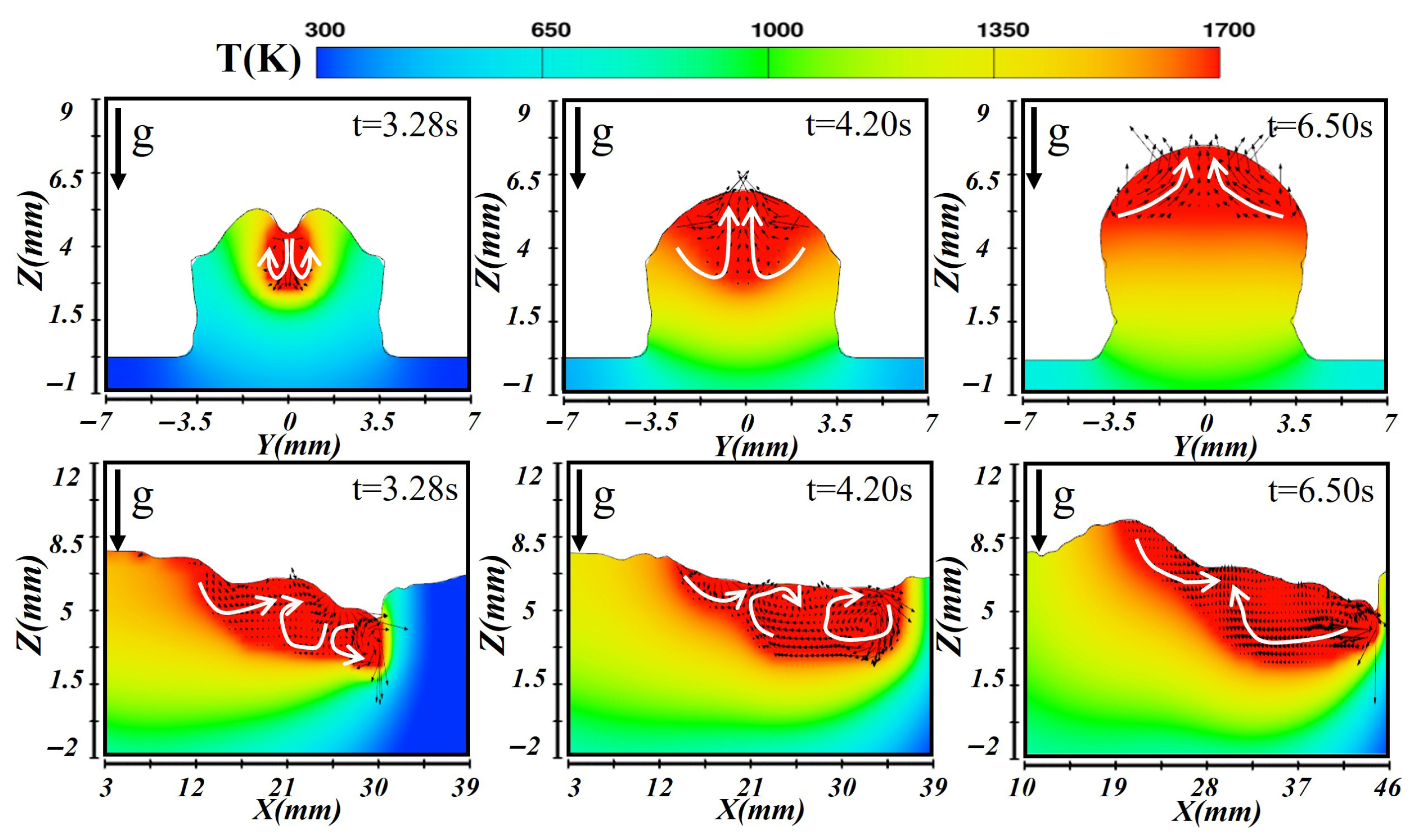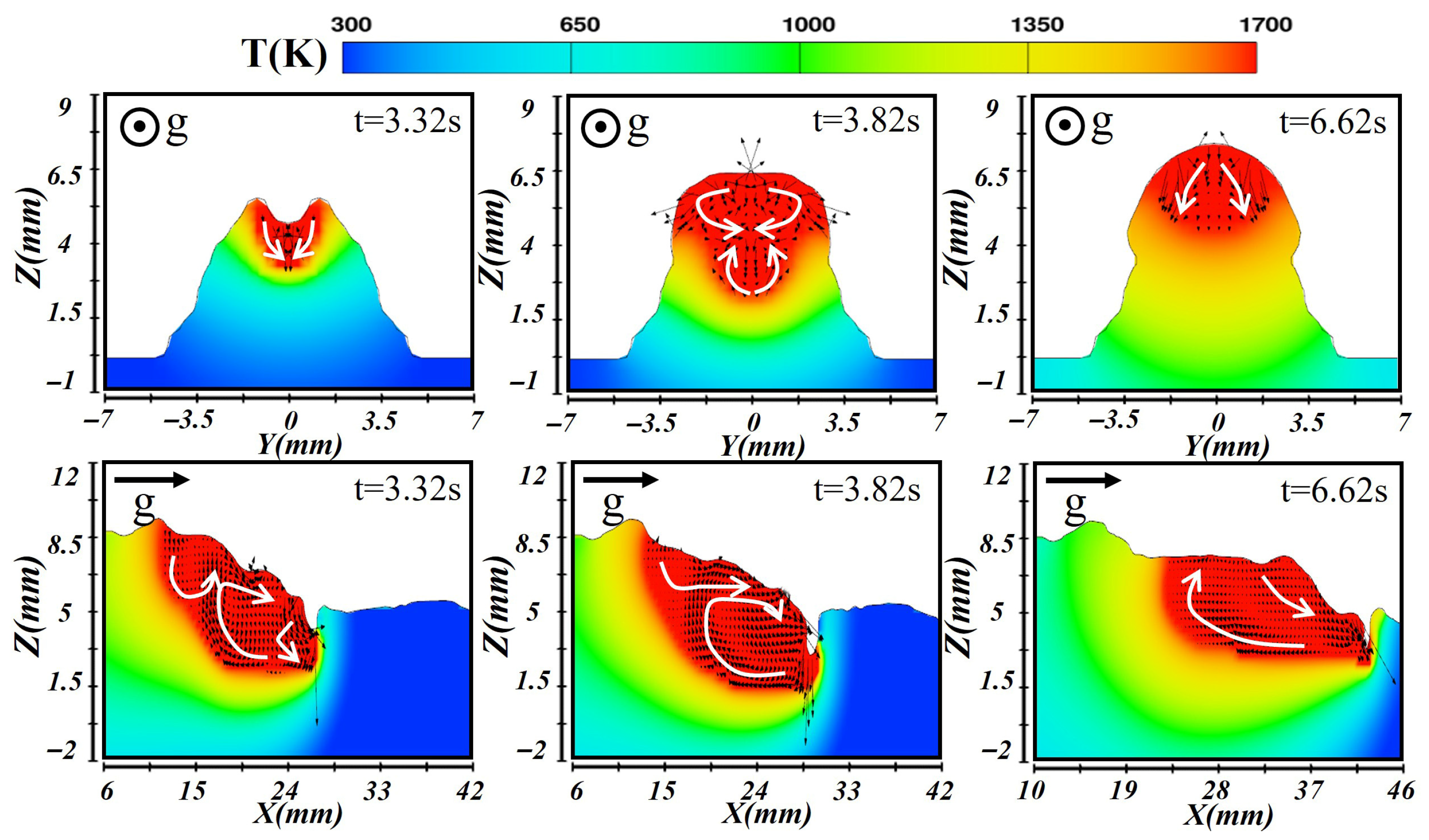 - Numerical simulations revealed that spatial orientation significantly influenced molten pool temperature distribution and flow behavior. In transverse deposition, molten metal migrated toward the gravity side; in vertical-up deposition, gravity limited lateral spreading and increased bead reinforcement; while in vertical-down deposition, gravity enhanced lateral flow but reduced penetration depth. Multi-layer deposition further enlarged the molten pool volume due to heat accumulation and slower cooling.