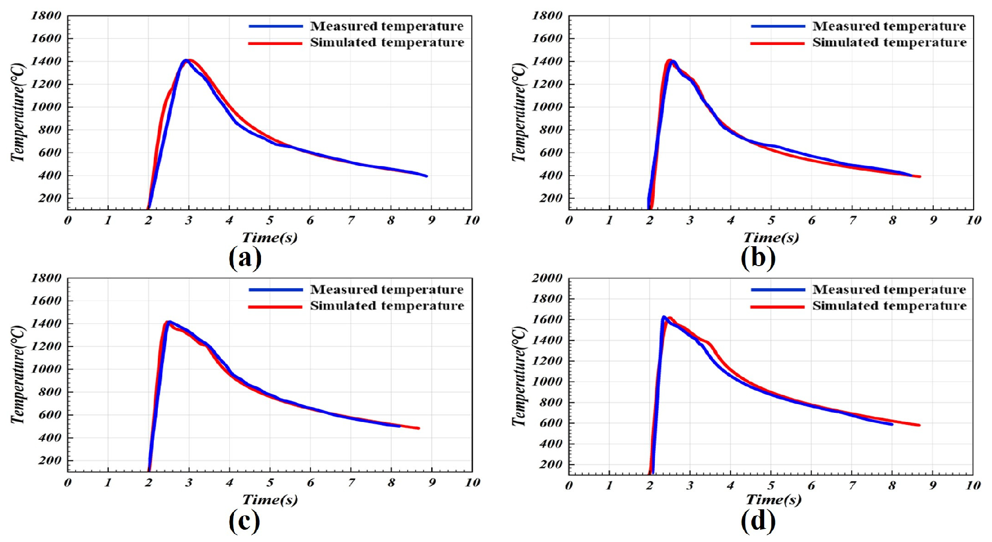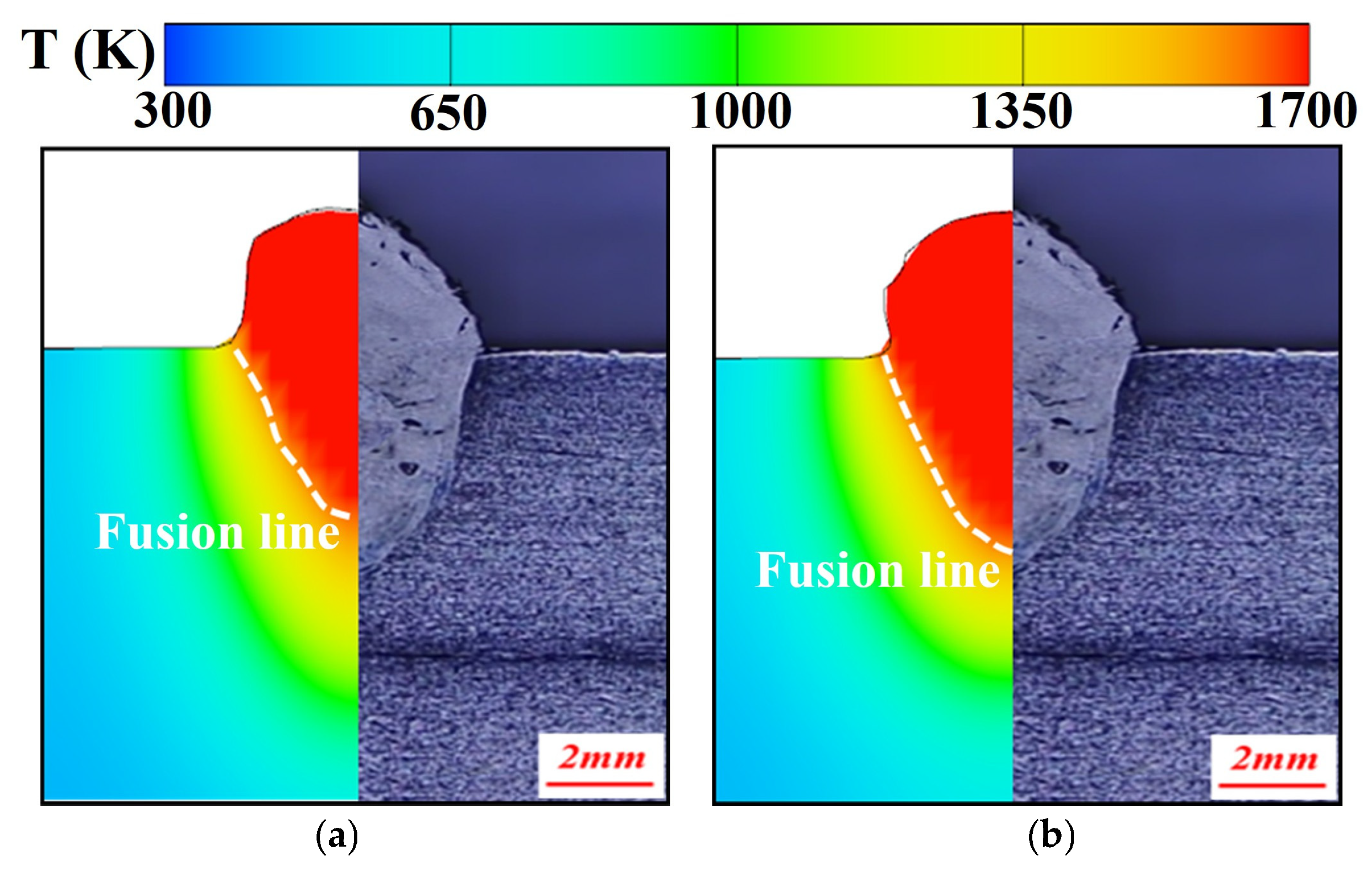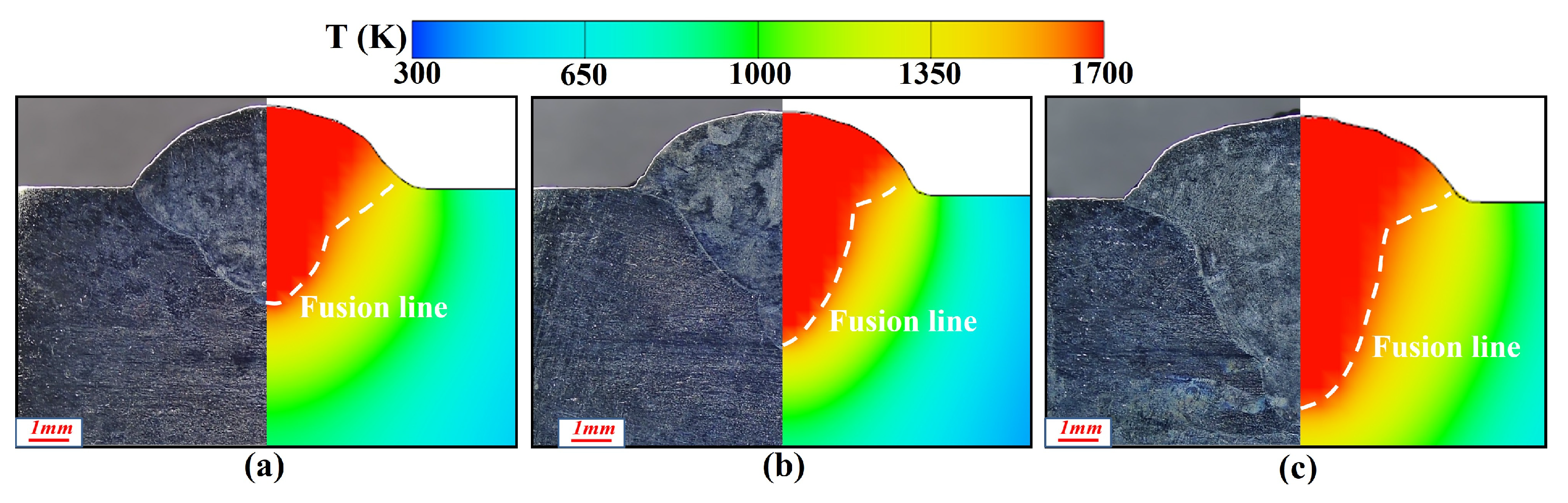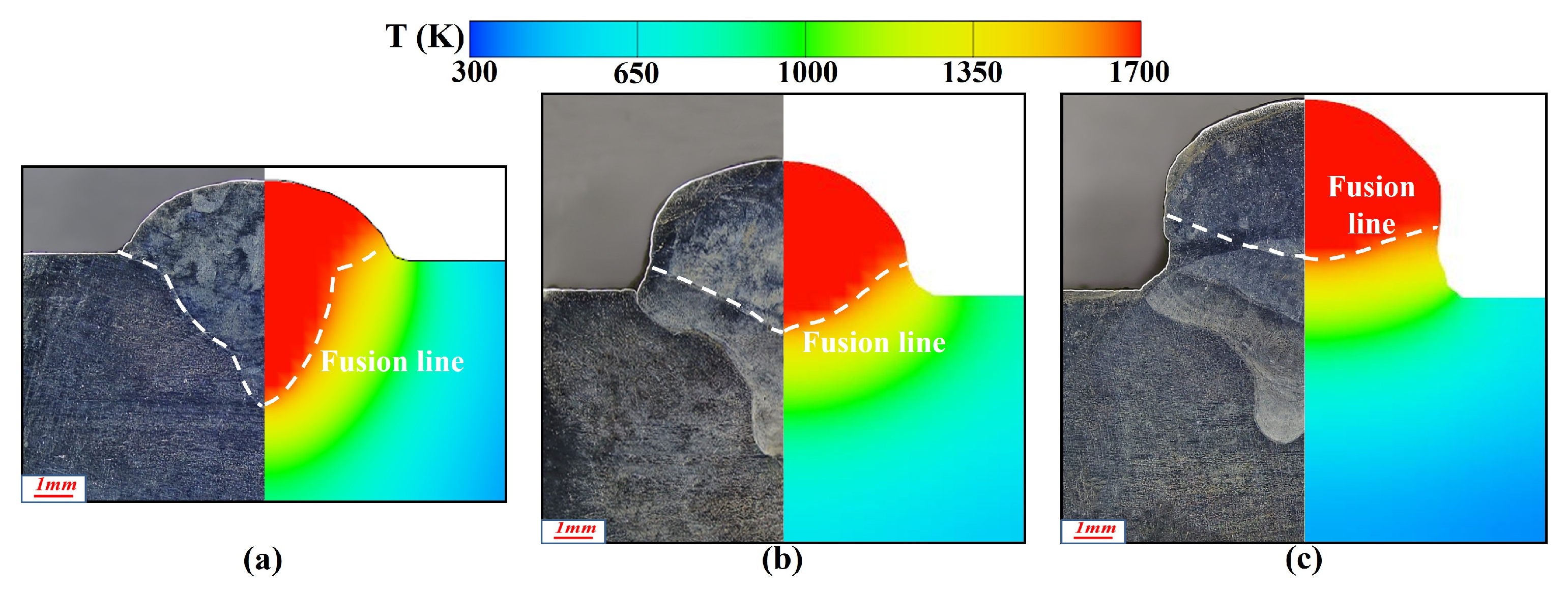 - Numerical simulations revealed that spatial orientation significantly influenced molten pool temperature distribution and flow behavior. In transverse deposition, molten metal migrated toward the gravity side; in vertical-up deposition, gravity limited lateral spreading and increased bead reinforcement; while in vertical-down deposition, gravity enhanced lateral flow but reduced penetration depth. Multi-layer deposition further enlarged the molten pool volume due to heat accumulation and slower cooling.