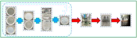 The cementitious materials and fine aggregates were weighed and loaded into the mixing pot. After dry mixing for 120 s, water and water reducer were added and stirred for 1 min, then fibers were added slowly. After fiber addition, the mix was stirred rapidly for 60 s, and specimens were cast from the prepared mix. Due to the poor fluidity of ECC, it is necessary to fill the mold several times in layers. After filling, the molds were compacted on a vibrating table for 60 s. Subsequently, the surface of the cast specimens in the molds was covered with a cling film. Then, the specimen was placed in a standard curing room for 28 days after removing the mold for 24 h, and mechanical properties, X-ray diffraction (XRD), thermogravimetric analysis (TG), Fourier Transform infrared spectroscopy (FTIR), and scanning electron microscopy (SEM) tests were carried out afterward. The specimen preparation process is shown in Figure 2.
