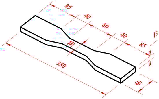 The uniaxial tensile test was conducted following the “Test Method for Mechanical Properties of Highly Ductile Fiber-Reinforced Cementitious Composites” (JC/T 2461-2018 [39]), and the dog bone-type specimen was used [40], with dimensions of 80 mm × 30 mm × 13 mm. Hengsi Shengda WDW-50 micro-computer control electronic universal testing machine purchased from Jinan Shidai Shantou Instrument Co. (Jinan, China) was used for loading; the loading speed was 0.05 mm/min, and the specimen size is shown in Figure 3. The flexural test was carried out under the “Cement Mastic Sand Strength Test Method” (ISO method) [41]. The size of the prism specimen was 40 mm × 40 mm × 160 mm, and the WHY-300/10 microcomputer-controlled compression tester produced by Shanghai Hualong Testing Instruments Co. (Shanghai, China) was used for testing. A 40 mm × 40 mm × 80 mm specimen was used for compressive strength testing using WHY-300/10 microcomputer-controlled pressure testing machine produced by Shanghai Hualong Testing Instrument Co.