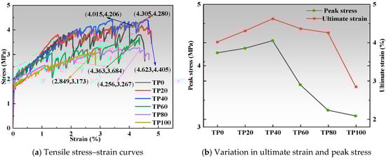The tensile stress–strain curves in Figure 4a reveal that each specimen, except for the TP100 specimen, displays characteristic strain hardening and multiple cracking behavior. When the tuff stone powder content is 0%, the ultimate tensile strain and peak tensile stress of TP0 are 4.0% and 4.2 MPa, respectively. When the tuff stone powder content is 20%, the maximum ultimate tensile strain and peak tensile stress of TP20 are 4.3% and 4.3 MPa, respectively, 7.2% and 1.7% higher than the control sample TP0. For 40% tuff stone powder, the ultimate tensile strain and peak tensile stress of TP40 reach the maximum values of 4.6% and 4.4 MPa, i.e., 15.1% and 4.7% higher than the control specimen, respectively. When the tuff stone powder content is 60%, the ultimate tensile strain and peak tensile stress of TP60 are 4.4% and 3.7 MPa, respectively. The ultimate tensile strain is 8.7% higher than that of the control sample, while the peak tensile stress is 12.4% lower than that of the control specimen. When the content of tuff stone powder is 80%, the ultimate tensile strain and peak tensile stress of TP80 are 4.3% and 3.3 MPa, respectively. The ultimate tensile strain is 6% higher than that of the control specimen, while the peak tensile stress is 22.3% lower than that of the control specimen. When the content of tuff stone powder is 100%, the ultimate tensile strain and peak tensile stress of TP100 are 2.8% and 3.2 MPa, respectively, 29% and 24.5% lower than the control specimen. The ultimate tensile strain is less than 3%, which is below the minimum requirements for ECC performance.