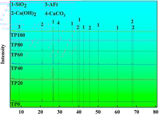 Figure 6 shows the X-ray diffraction (XRD) patterns of 28d-cured ECC specimens for different tuff stone powder replacement ratios. It can be observed that the primary components of ECC are Silica (SiO2) and Portlandite (Ca(OH)2) after tuff stone powder replaces quartz sand with different replacement ratios, there is also a small amount of ettringite (AFt) and calcite (CaCO3) [43,44] The diffraction peak of SiO2 is the strongest, and its intensity decreases with an increase in the replacement ratio of tuff stone powder. This is mainly because the main component of quartz sand in ECC is SiO2. However, the main component of tuff stone powder is SiO2, which is lower than that of quartz sand, so it decreases with the increasing tuff stone powder replacement ratio. When quartz sand is completely replaced by tuff stone powder, the intensity of the SiO2 diffraction peak is still high. Ca(OH)2 is the hydration product of Portland cement, and its intensity of the diffraction peak decreases gradually with the increase in the tuff stone powder replacement ratio. This is mainly because the tuff stone powder particles provide nucleation sites for the ECC hydration products. With the secondary hydration reaction of the tuff stone powder, the hydration products generated by the partially reactive SiO2, Al2O3, and Ca(OH)2 in the fly ash and silica fume closely connect the tuff stone powder and the cement hydration products to fill the pores and consume a part of Ca(OH)2 [45,46]. It is seen that the tuff stone powder can improve the cement hydration products, yet its incorporation does not produce new substances.