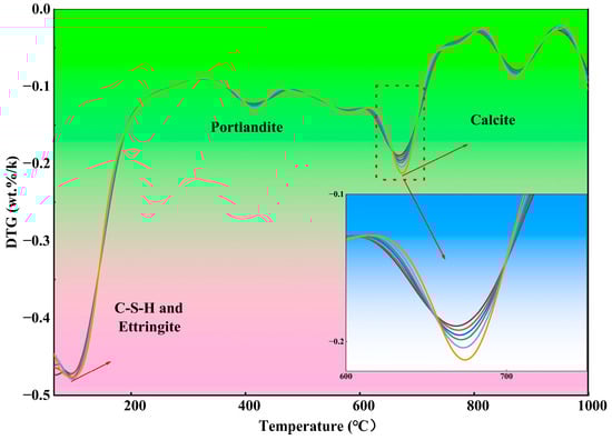 The results of the thermogravimetric analysis (TG) of 28-day cured ECC specimens with different replacement ratios of tuff stone powder are shown in Figure 7. The mass of each specimen decreases with the increase in temperature. At 1000 °C, the mass loss rate of each sample is between 13.36% and 14.13%. When the temperature is 0~200 °C, 400~500 °C, 600~700 °C, and 800~900 °C, the curve reaches the peak value, and the weight loss rate of the sample is accelerated. This is because a series of reactions occur within the matrix as the temperature increases. The peak observed between 600~700 °C, resulting from the decarbonation of calcite, shows an increasing trend with the addition of tuff stone powder, and there is no significant difference between the other three peaks. It is also noted that tuff stone powder can improve cement hydration products [46]. Although the incorporation of tuff powder improves the hydration products in ECC, when the content of tuff powder exceeds 40%, the adverse effect of the reduced matrix strength caused by the supersaturation of pore structure on the performance of ECC is greater than the promotion effect of tuff powder on the hydration products. After the quartz sand is replaced by a large amount of tuff powder, too much fine aggregate in the ECC matrix may lead to matrix instability, so the mechanical properties of ECC are gradually reduced. However, incorporating tuff powder does not cause ECC to produce new chemicals.