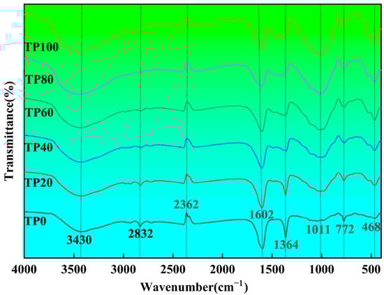 Figure 8 shows the FTIR spectra of different tuff stone powder replacement ratios after 28 days of age. The antisymmetric stretching vibration of -O-H corresponds to C-S-H gel, Ca(OH)2 and adsorbed water. The symmetrical stretching vibration of -C-H is attributed to the residual organic matter of the water-reducing agent. The stretching vibration of C=C=C is the interference peak of CO2 in the test environment. The symmetrical stretching vibration of C=O corresponds to calcite. The antisymmetric bending vibration of -C-H is caused by the residual organic matter of the water-reducing agent. The stretching vibration of C-O corresponds to hydration products such as C-S-H gel and calcium aluminate hydrate. The out-of-plane bending vibration of -C-H is caused by the residual organic matter of the water-reducing agent. The in-plane bending vibration of Si-O corresponds to SiO2. It is observed that when the dosage of tuff stone powder is 0, the broad peak of -O-H anti-symmetric telescopic vibration of TP0 appears at 3430 cm−1, the symmetric telescopic vibration peak of -C-H, and the anti-symmetric bending vibration peak appeared at 2832 cm−1 and 1364 cm−1, respectively, while the peak of C=C=C telescopic vibration appeared at 1602 cm−1. Also, the symmetric telescopic vibration peak of C=O at 1602 cm−1, telescopic vibration peak of C-O at 1011 cm−1, out-of-plane bending vibration peak of -C-H at 772 cm−1, and in-plane bending vibration peak of Si-O at 468 cm−1 were observed. The transmittance of the -C-H and C=O vibration peaks exhibited a decreasing trend with increased tuff stone powder doping. In contrast, the transmittance of the telescopic vibration peak of C-O showed an increasing trend with the increase in tuff stone powder doping. The symmetric telescopic vibration peak of C=O was shifted with the dosage of tuff stone powder. The other characteristics of the peaks, such as transmittance and location, were the same as those of the characteristic peaks of TP0. Therefore, it is inferred that tuff powder incorporation does not lead to the formation of new chemical bonds in ECC. Furthermore, comparison of characteristic peak intensities was conducted through a focus on analyzing the changes in light transmittance at 1011 cm−1 (C-O stretching vibration, corresponding to C-S-H gel) and 3430 cm−1 (-O-H stretching vibration). The transmittance was the lowest at 1011 cm−1 in the TP40 group (18% lower than that of TP0), indicating that the formation of C-S-H gel was the highest. The light transmittance was the highest at 3430 cm−1, indicating that the hydroxyl content in the matrix decreased after the zeolite mineral adsorbed free water, which was consistent with the result that the shrinkage increase (17.5%) of the TP40 group in the drying shrinkage test was lower than that of the other groups.