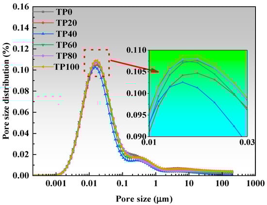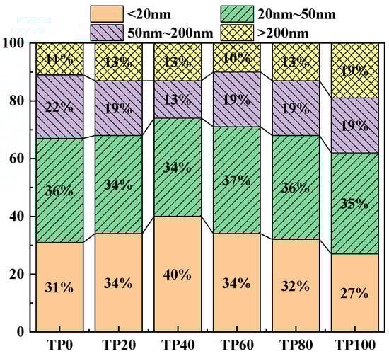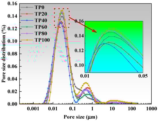 Figure 9 and Figure 10 present the porosity and pore size distribution results. As the content of tuff stone powder increases, the pore size of the most probable hole decreases first and then increases. At a tuff stone powder content of 40%, the pore size of the most probable hole reaches a minimum value. Upon reaching 80% tuff stone powder content, the pore size of the most probable hole is similar to that of the benchmark most probable hole. When the content of tuff stone powder reaches 100%, the pore size of the most probable hole reaches the maximum value. This is primarily because the micro-aggregate filling effect is more pronounced when the tuff stone powder content is minimal [47]. When the tuff stone powder content is excessive, the filling is supersaturated, and the excess tuff stone powder exists in the hydration reaction product in a ‘free’ state, forming a large number of pores and destroying the internal pore structure of the matrix [45,48].