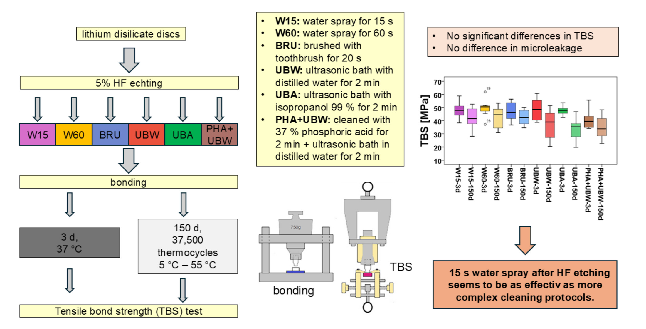 - No additional procedure, just an extended cleaning time with water spray for 60 s (W60). Control group.