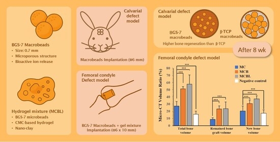 Choi W, Kang S, Nham E, Go S-h, Lee D-y, Kim B-H, Oh J-K. CaO–SiO2–P2O5–B2O3-Based Bioactive Glass (BGS-7) Macrobeads Incorporated in Hydrogels Aid Bone Regeneration: Evaluation in Rabbit Calvarial and Femoral Defect Models. Materials. 2026; 19(2):309. https://doi.org/10.3390/ma19020309
