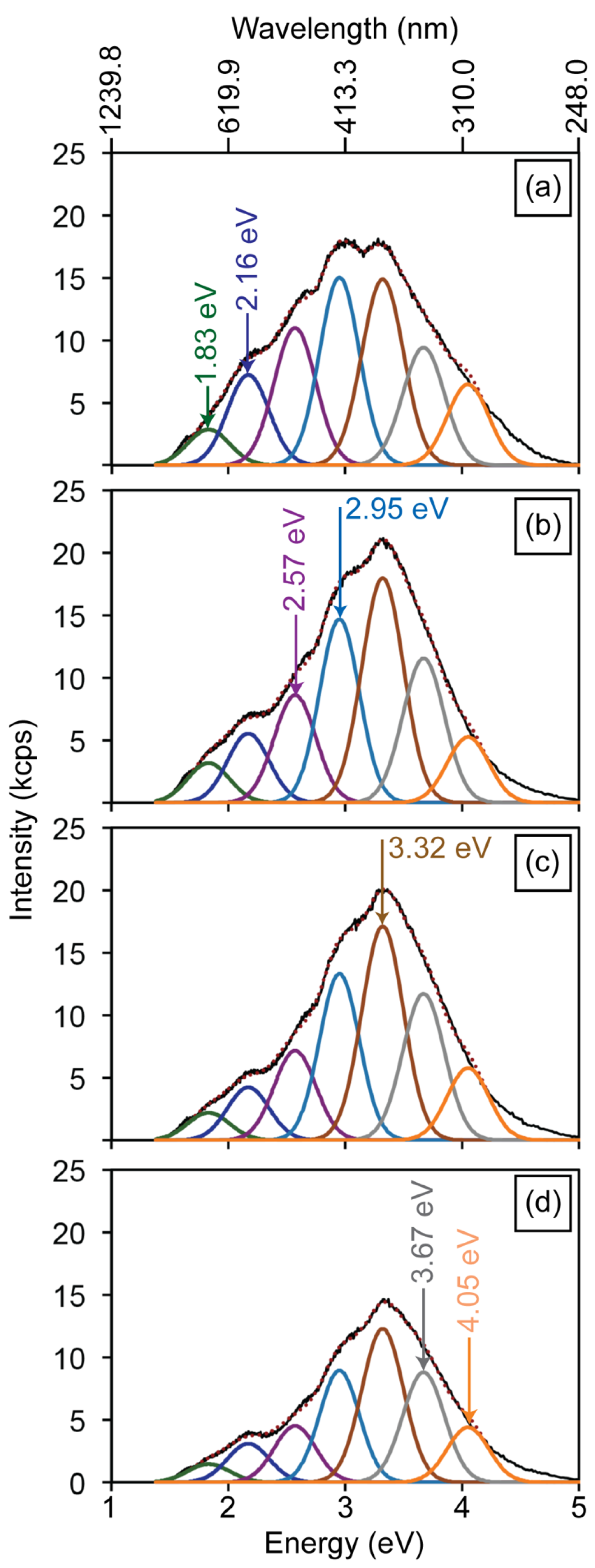 | Emission Energy (eV) | Electronic Transition | τ1 (s) | 1/τ1 (10−3 s−1) |