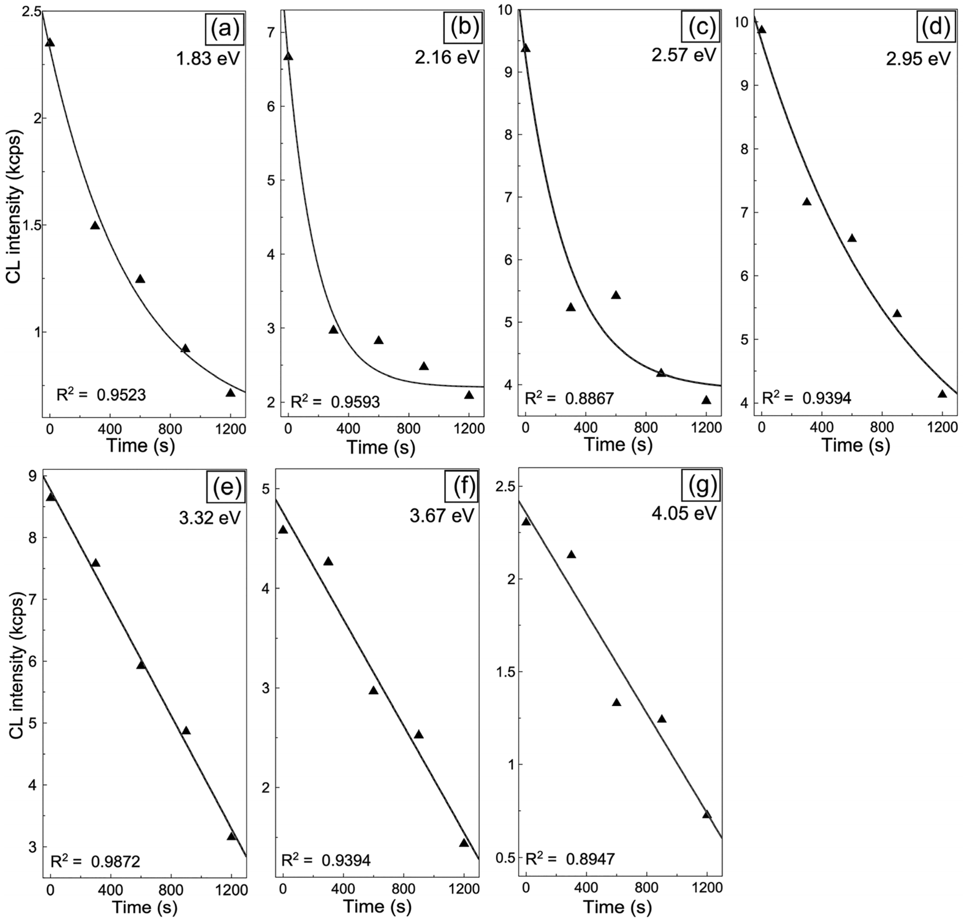 - Dierre, B.; Yuan, X.L.; Sekiguchi, T. Luminescence evolution of ZnO single crystal under low-energy electron beam irradiation. J. Appl. Phys. 2008, 104, 043528. [Google Scholar] [CrossRef]