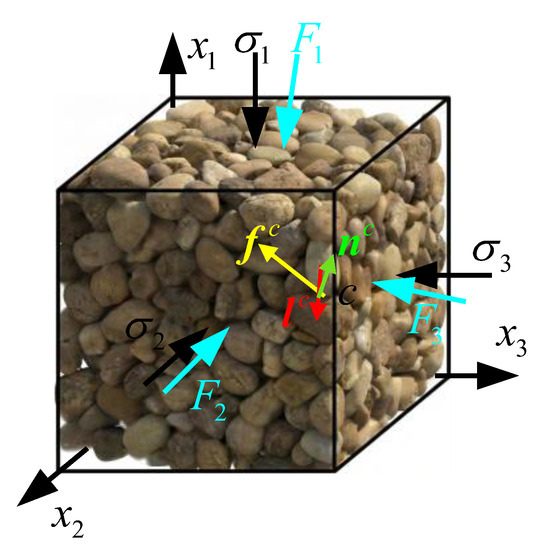 where V is the volume of the RVE, is the contact force vector at the c-th contact, and is the branch vector connecting the centers of the two contacting particles, as shown in Figure 1.