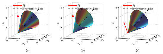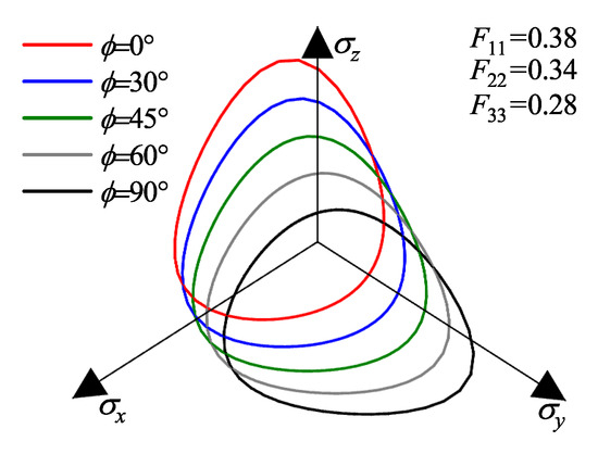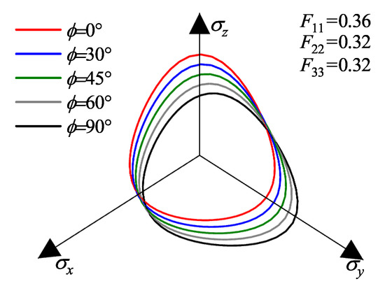 Figure 9 and Figure 10 present the evolution of failure envelopes in the principal stress space for transversely isotropic and orthotropic materials, respectively, as calculated by the proposed strength criterion under different loading angles .