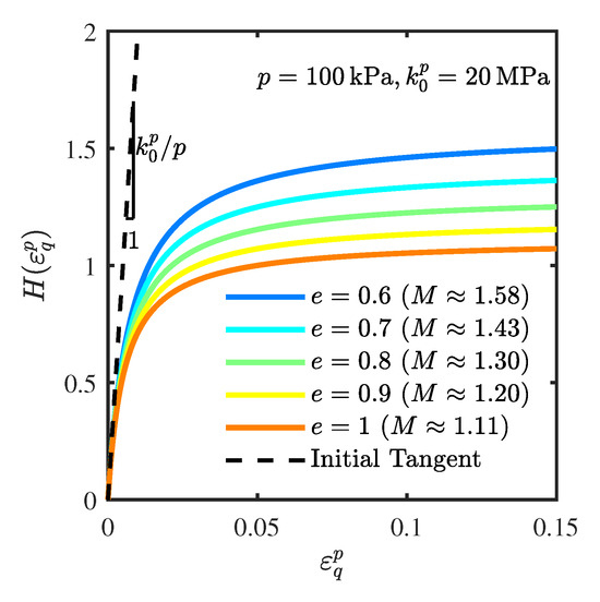 where is a reference pressure (taken as ); and are material constants; and e represents the current void ratio, which evolves from the initial void ratio according to the relation .