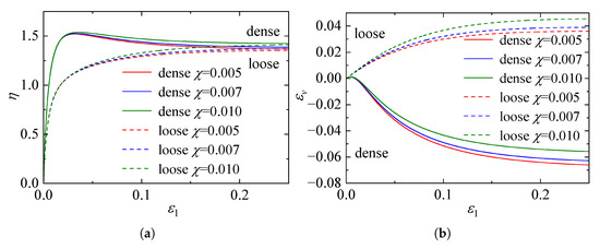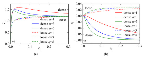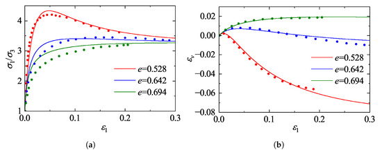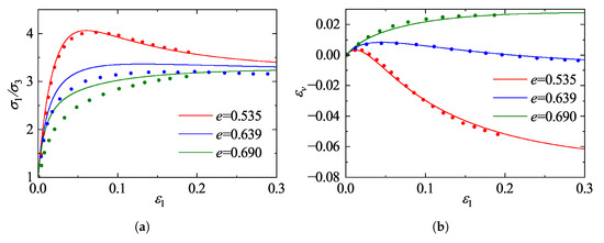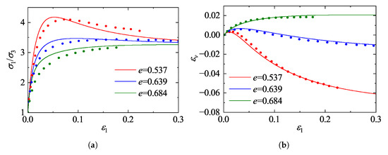 Figure 14 illustrates the comparisons of stress ratio ()-strain responses for specimens with different initial void ratios sheared under a constant confining pressure of 100 kPa at varying intermediate principal stress ratios b. As depicted in Figure 14, both the initial void ratio and the b-value significantly influence the mechanical response. The denser specimens (, Figure 14a) exhibit distinct strain-softening behavior, whereas the looser specimens (, Figure 14b) display predominant strain-hardening characteristics. The model accurately captures the dependency of strength on the intermediate principal stress; specifically, both the peak and critical state stress ratios exhibit a decreasing trend as the b-value increases from 0 to 1. Notably, for , the stress-strain curves tend to converge, suggesting that the internal friction angle remains essentially constant in this range, a phenomenon consistent with previous experimental findings [44]. Overall, the close agreement between the model predictions and the DEM data for both dense and loose states demonstrates the robustness of the proposed model in describing the mechanical behavior of granular materials under general three-dimensional stress conditions.
