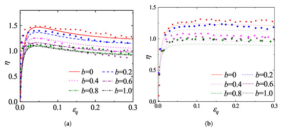 Comparison between model predictions and DEM simulations [42] for different intermediate principal stress ratios b: (a) dense sample (); (b) loose sample ().