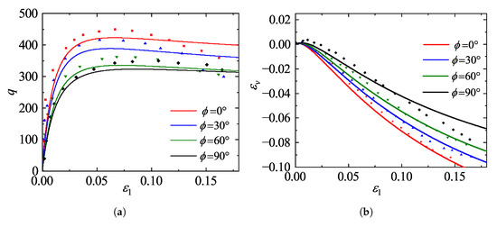 Figure 15 presents the comparisons of deviatoric stress q and volumetric strain versus axial strain for specimens with different initial deposition angles (). As illustrated in Figure 15a, the deposition angle exerts a profound influence on the strength characteristics. The specimen with (where the major principal stress is perpendicular to the bedding plane) exhibits the highest peak strength accompanied by pronounced strain softening. As the deposition angle increases, the peak strength decreases monotonically, and the mechanical response progressively transitions from strain softening to strain hardening. Correspondingly, the volumetric strain curves in Figure 15b reveal that dilatancy is increasingly suppressed with higher deposition angles, leading to greater volumetric contraction, which highlights the constraint imposed by the anisotropic fabric on volumetric deformation. The results show that the proposed model effectively reproduces the changes in mechanical behavior resulting from the anisotropy of sand.