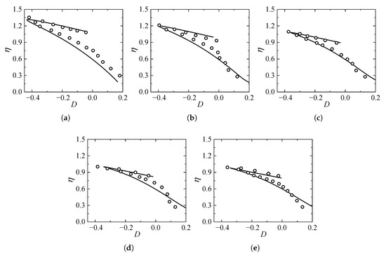 The behavior of the derived stress–dilatancy relationship (Equation (25)) is illustrated in Figure 4. The curves depict the evolution of the dilatancy ratio D versus the stress ratio () for both loose and dense specimens with varying initial dilatancy parameters . For dense sand (solid lines), the model predicts a distinct phase transformation behavior: the material initially undergoes volumetric contraction () followed by significant dilation () after crossing the phase transformation line (). An increase in the parameter enhances the initial contraction tendency. For loose sand (dashed lines), the material exhibits continuous contraction throughout the shearing process, approaching a constant volume state () at large strains. These trends are consistent with typical experimental observations for granular materials.