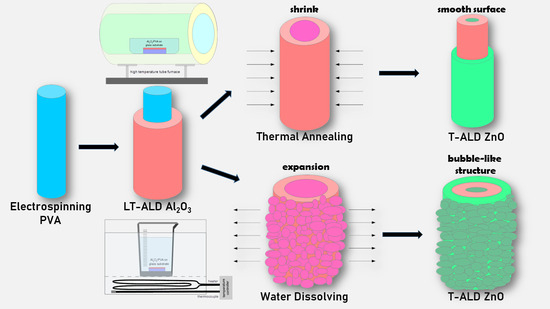 17]. Initially, electrospinning is used to produce HAR polymer fiber scaffolds (e.g., PVA, PAN, PVP) with diameters ranging from tens of nanometers to several micrometers. ALD is then employed as a post-fabrication step to deposit thin, uniform, and pinhole-free inorganic films (e.g., Al