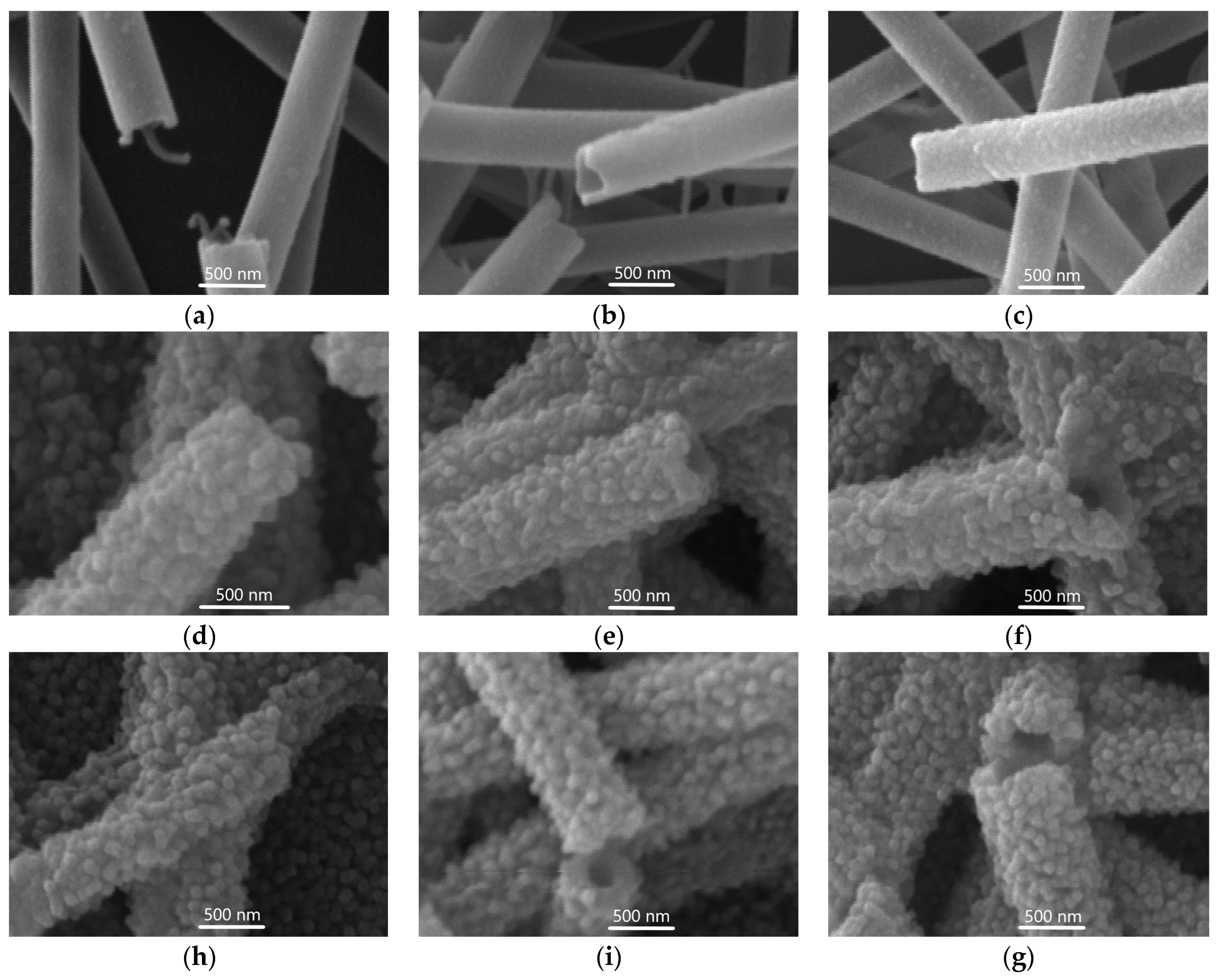 12]. To obtain the hollow fiber structures, the inner polymer core is usually removed through high-temperature annealing (calcination). When conducted under an appropriate temperature regime, this process ensures complete removal of the polymer, resulting in smooth surfaces and enhanced crystallinity. An alternative, less studied method for polymer removal is dissolution [