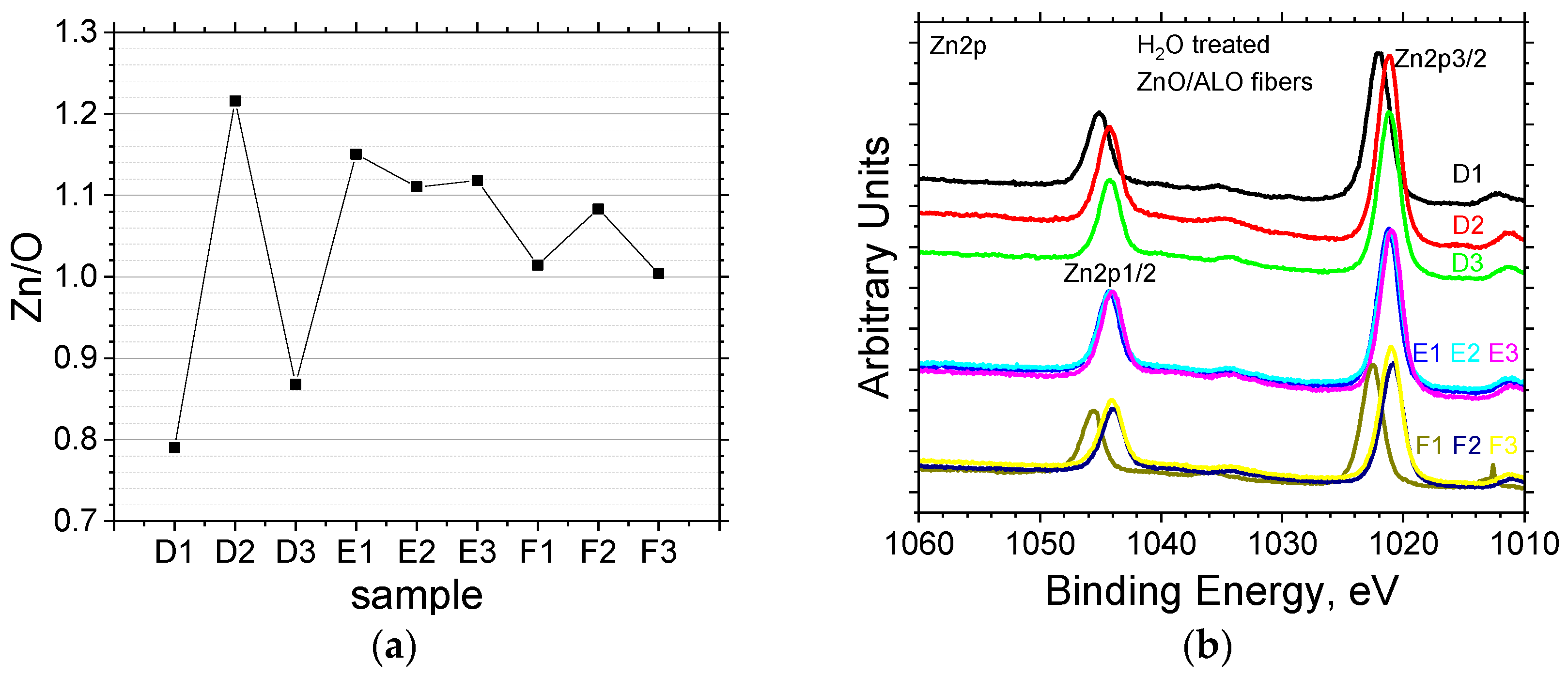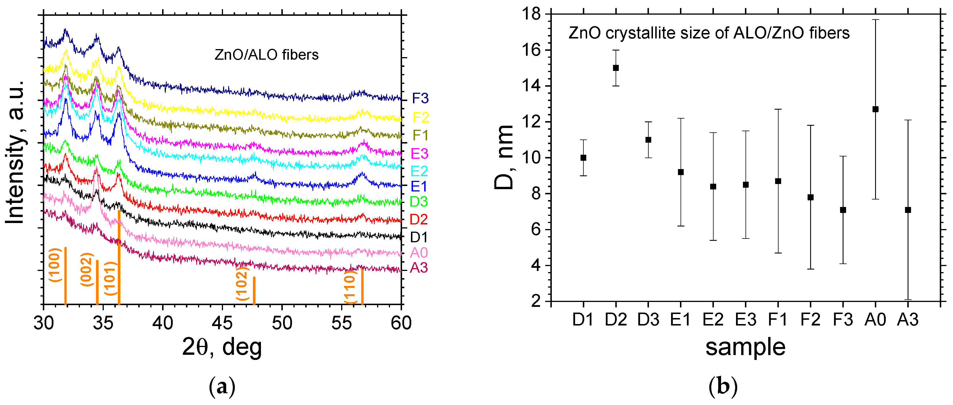 Figure 4a) clearly shows a higher diffraction peak intensity for hollow fibers obtained by water dissolution (Series D, E, F) compared to those obtained by thermal annealing (Series A). This is primarily attributed to a greater total amount of ZnO present in the dissolution-treated fibers. As the ALD parameters and substrate area (1 cm