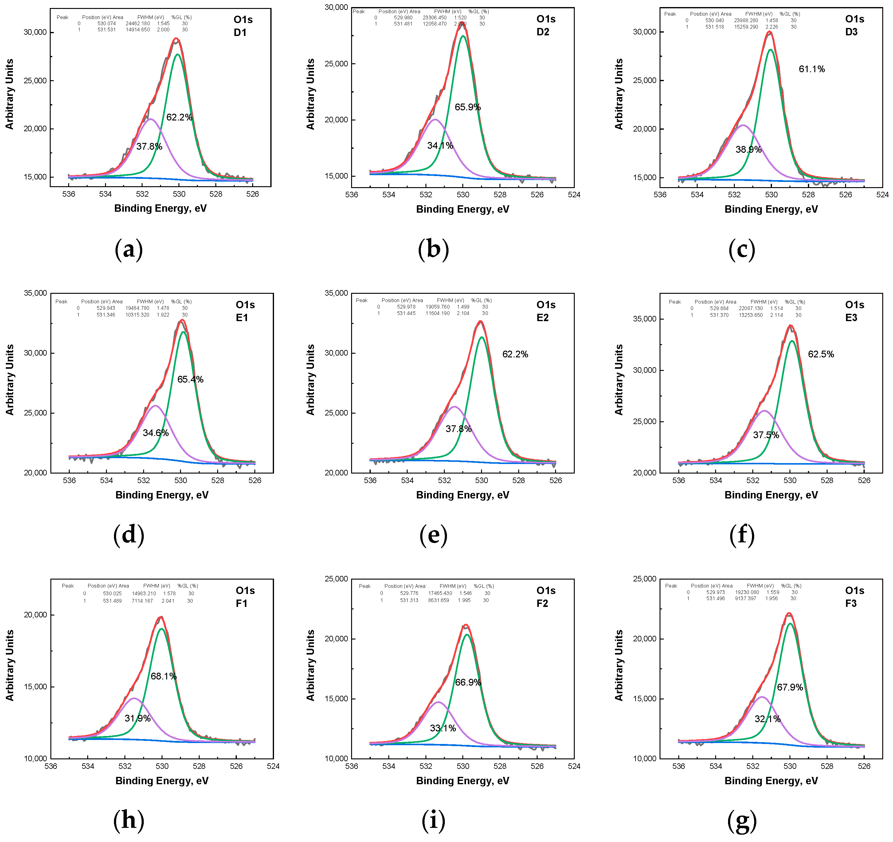 Figure 6) reveals two primary Gaussian components: (1) a peak centered around 530 eV, characteristic of lattice oxygen within the stoichiometric ZnO wurtzite structure; and (2) a peak at approximately 531.5 eV, attributed to oxygen vacancies or defects (non-stoichiometric oxygen). Although slight deviations in the peak position were noted for both components, no clear correlation with the water treatment parameters was established (