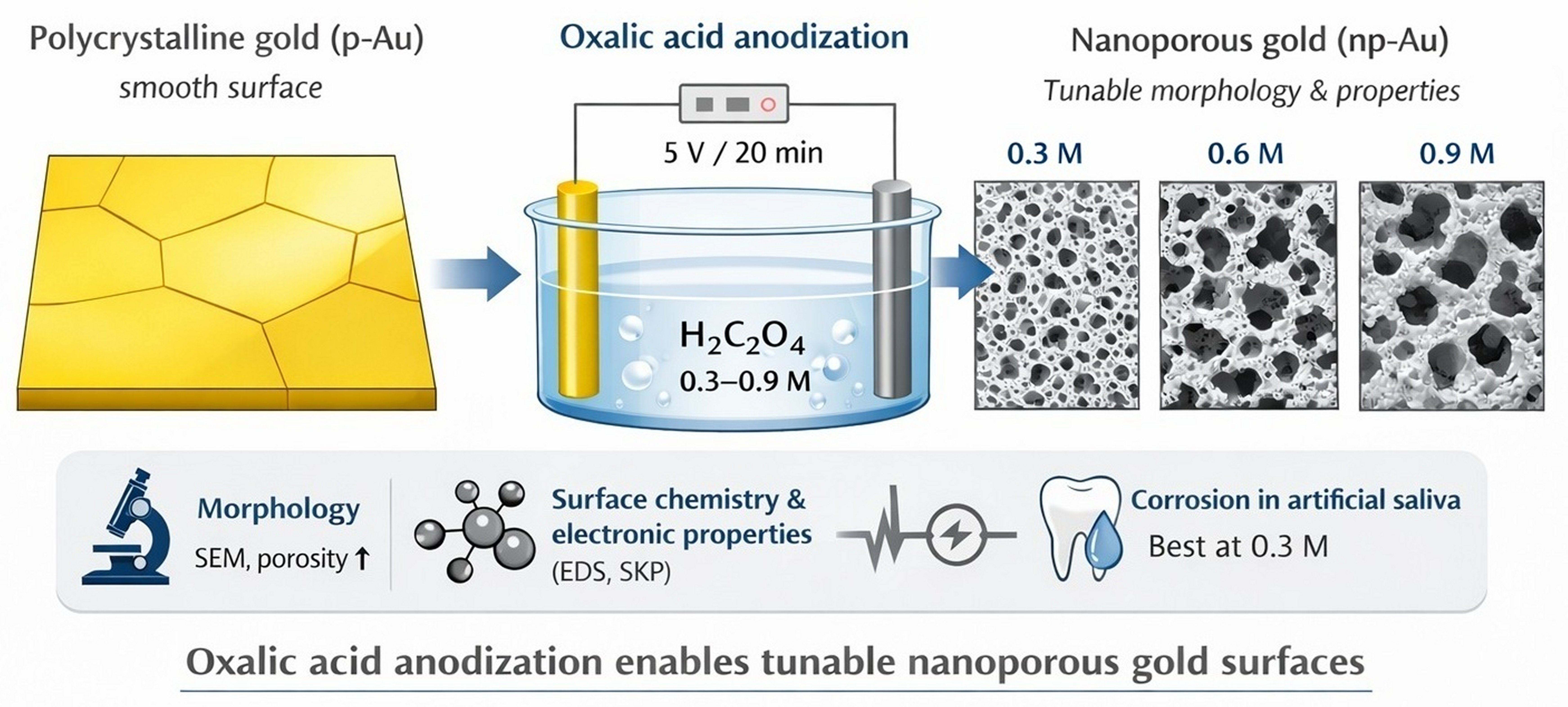 Łosiewicz B, Nowińska D, Kubisztal J, Osak P. Surface Nanoengineering of Gold via Oxalic Acid Anodization: Morphology, Composition, Electronic Properties, and Corrosion Resistance in Artificial Saliva. Materials. 2026; 19(2):335. https://doi.org/10.3390/ma19020335