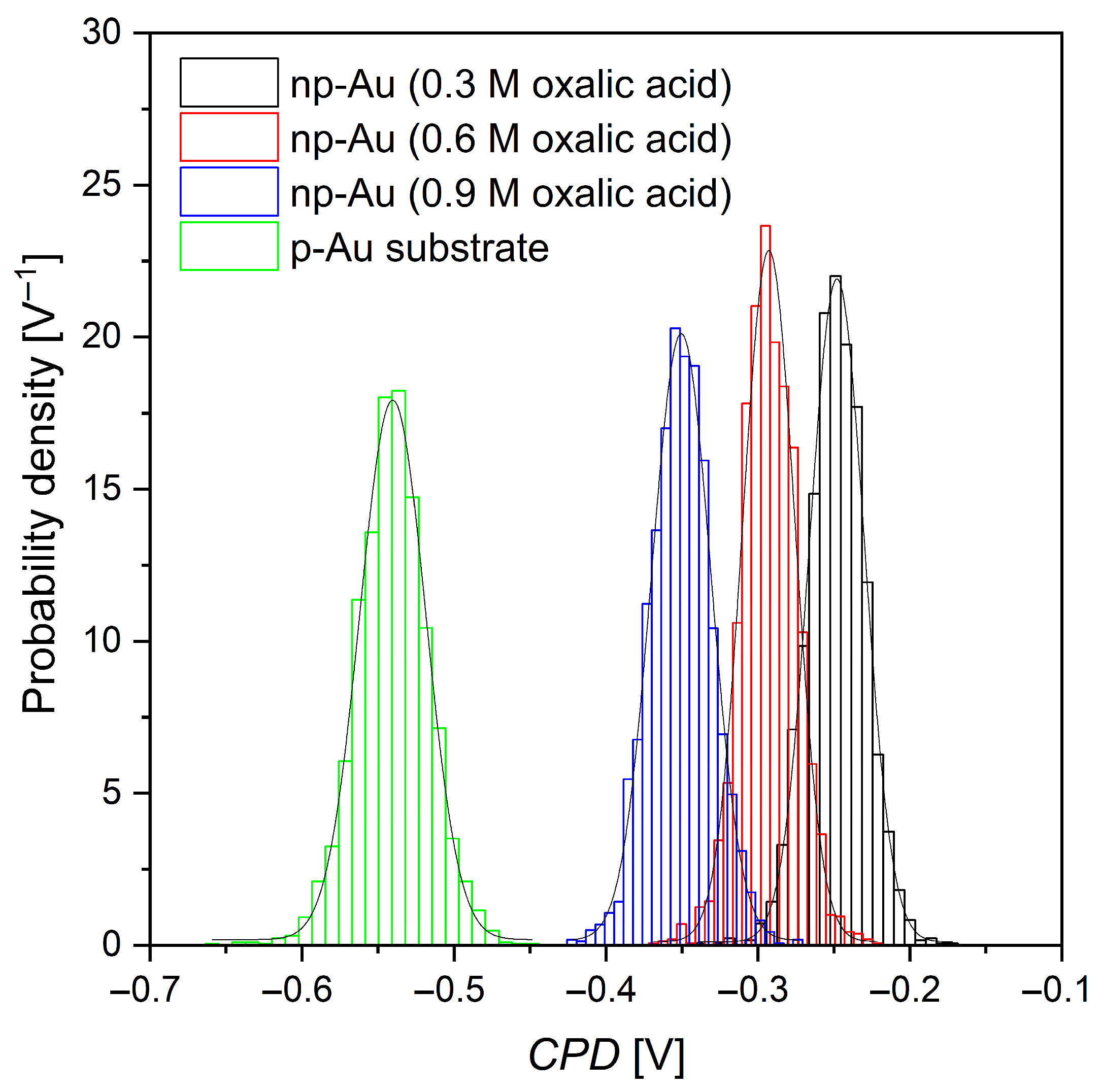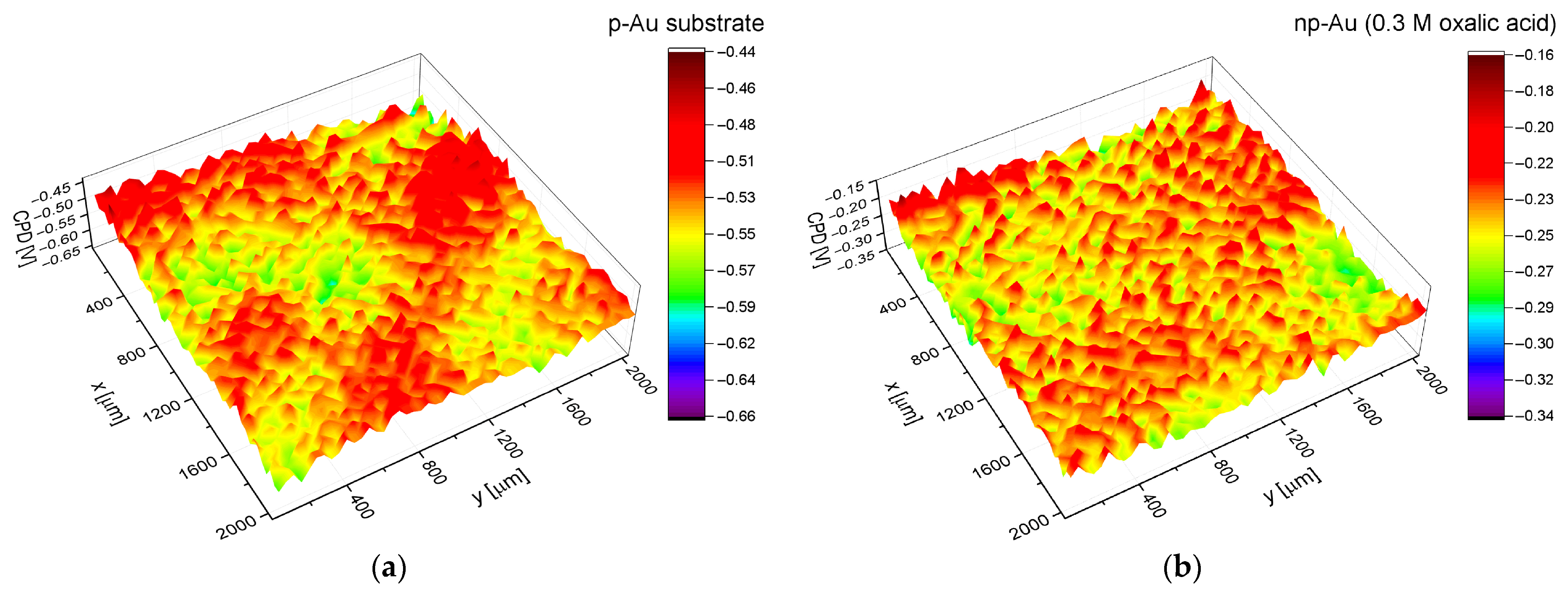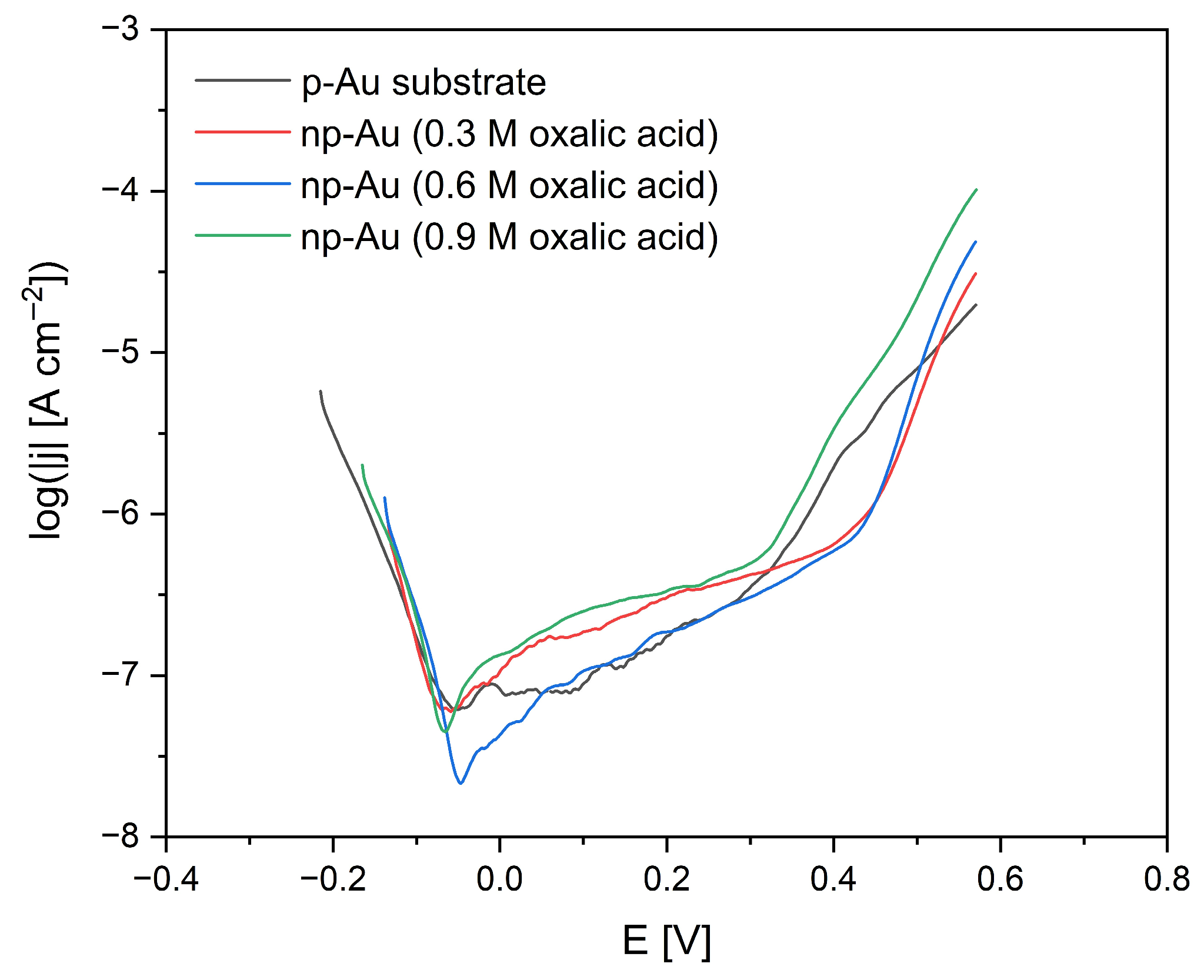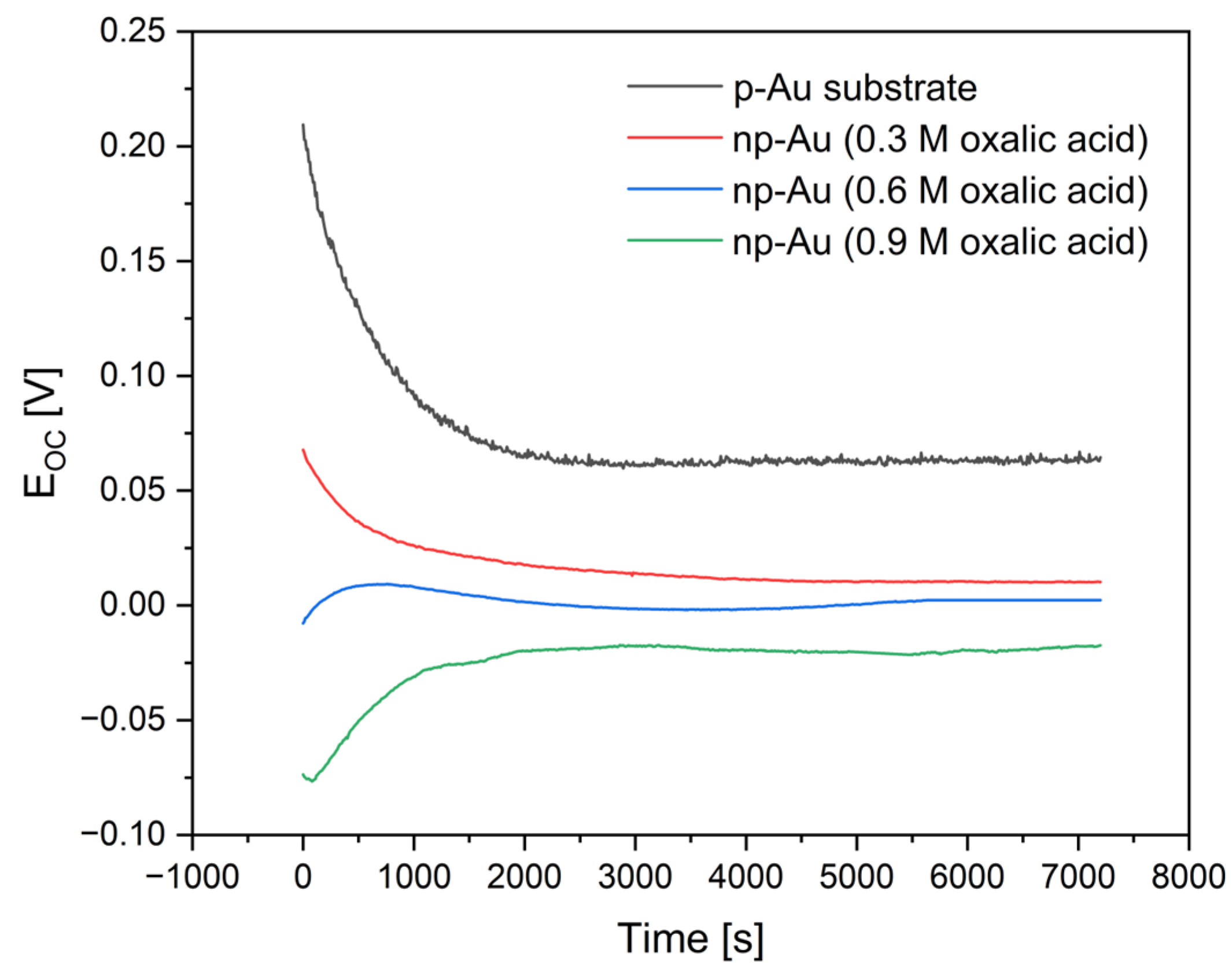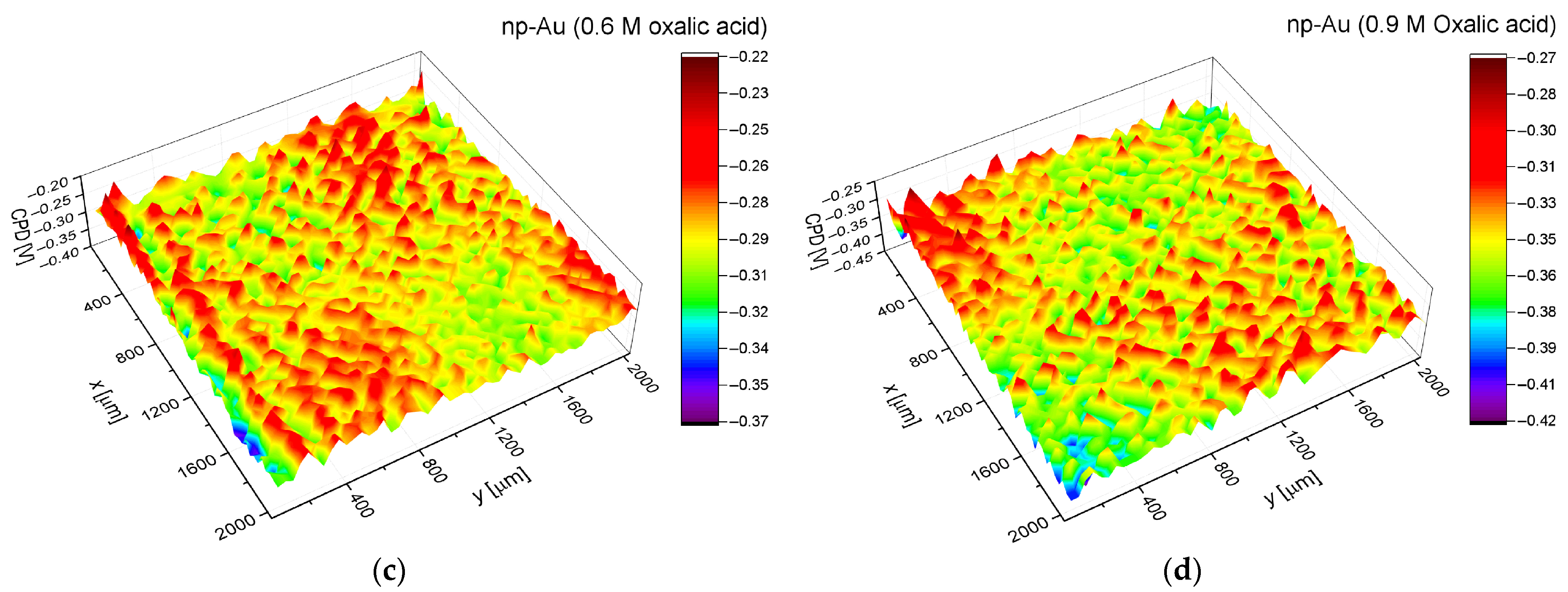 | np-Au (0.9 M oxalic acid) | −0.3278 ± 0.0005 | 0.3286 ± 0.0005 | −0.015 ± 0.069 | 0.812 ± 0.152 |
